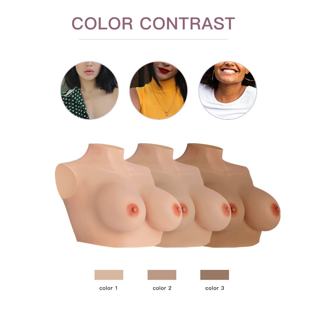 I only have bought a few different sets of silicone breasts like these, and this is my first "breast plate" model (previously only having individual breasts which go into a containing bra).It's got its pros and cons. The neck on this is *very* tight (not sure if that's intentional or if I should consider loosening it somehow), but does fit. The breast sizes themselves seem... generous/oversized though not to a dramatic level.Yellow was basically "pale skintone" not a sickly yellow, which is good.If you get the silicone over the cotton, expect them to be quite heavy! It's good practice for real ones, they're heavy too.