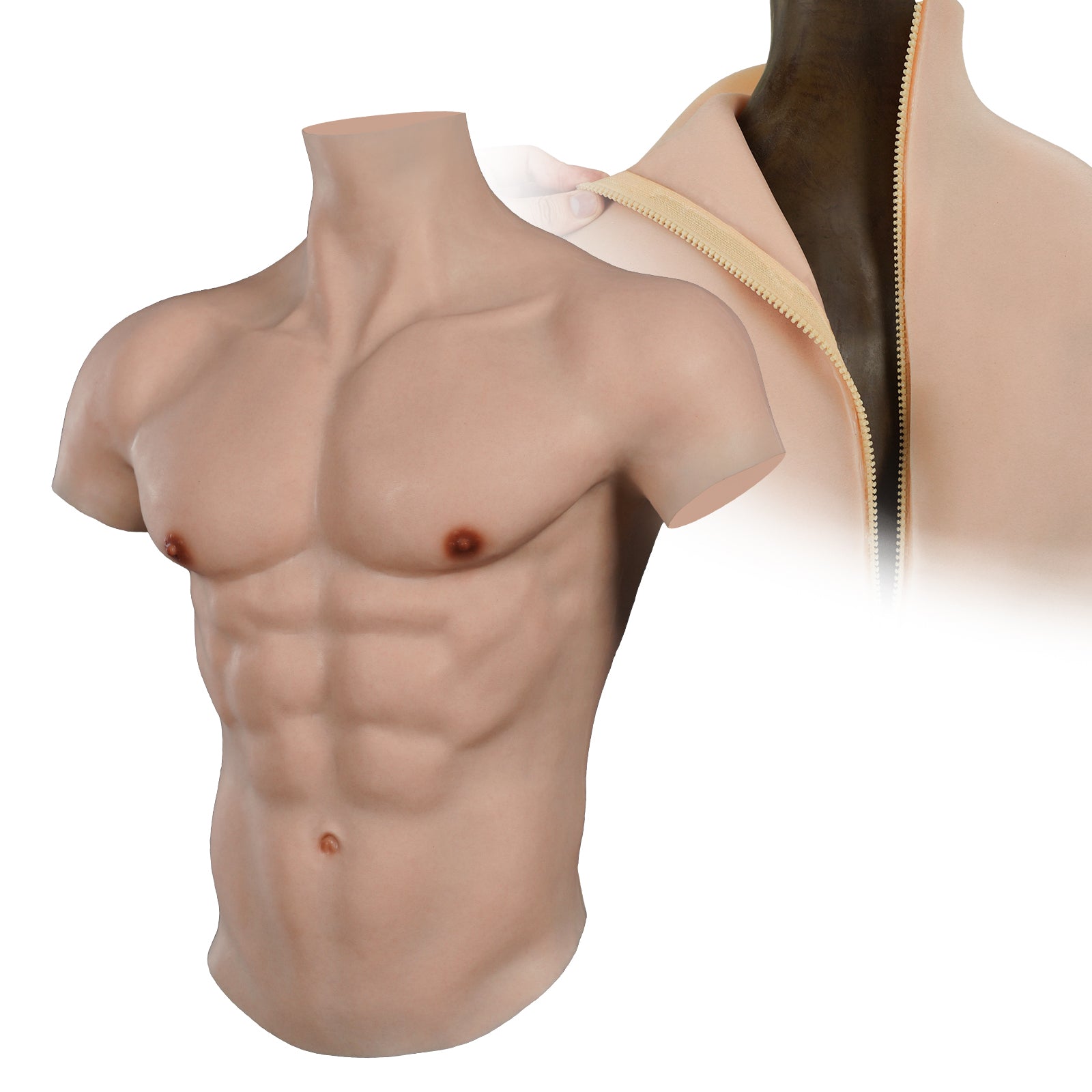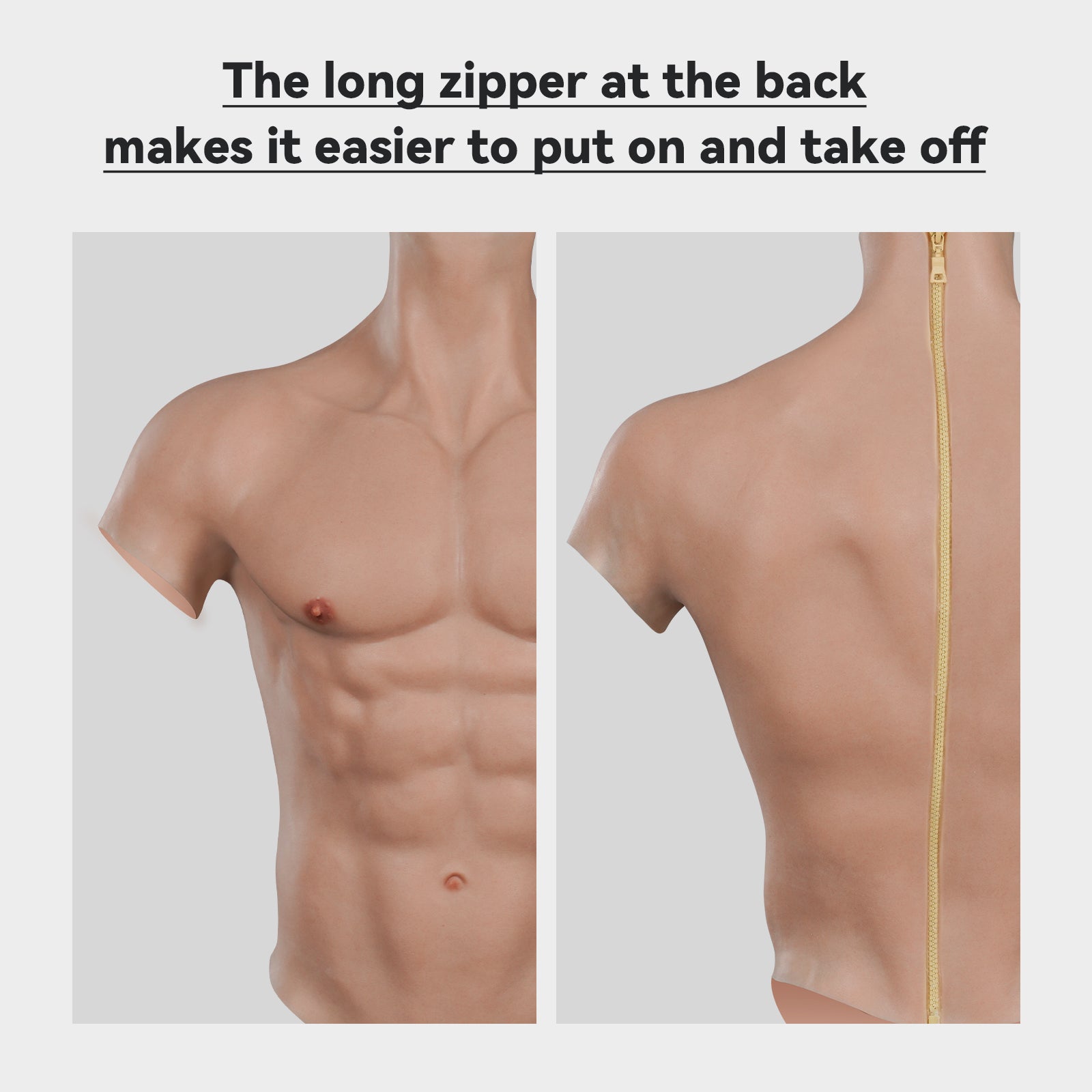 3 photos, 3rd is WITHOUT the body suit to show comparison(can't show without shirt because female). Product is amazing. You have to wash and powder it as it comes slightly oily. Not a bad thing. Bought baby powder, did the job. Powder yourself occasionally while wearing for a longer period and you'll feel just fine. Gets slightly sticky if you sweat more than just a little. Wore it for 8 hours straight today and was completely fine. BEFORE YOU TAKE IT OFF THOUGH, POWDER INSIDE IT!Like put powder in the neck and in your armpits. It is a 2 person job to remove but it is much harder if you do not do this!I am nonbinary and am afab. This gives me a massive improvement on my self image. I wear a binder underneath it. Neck is a bit uncomfortable but I think I will be trimming it. Great product, just treat it with care and it will treat you with care.