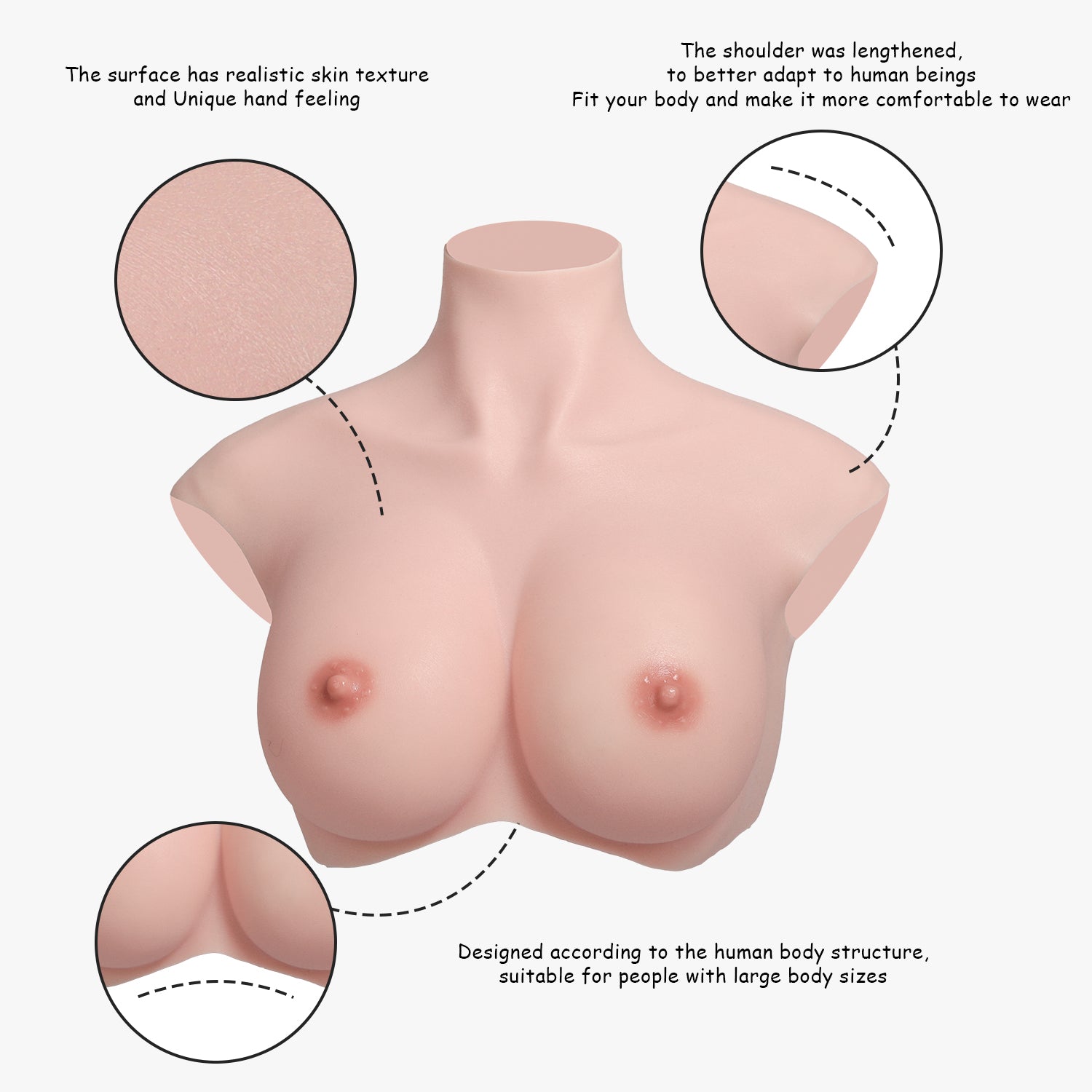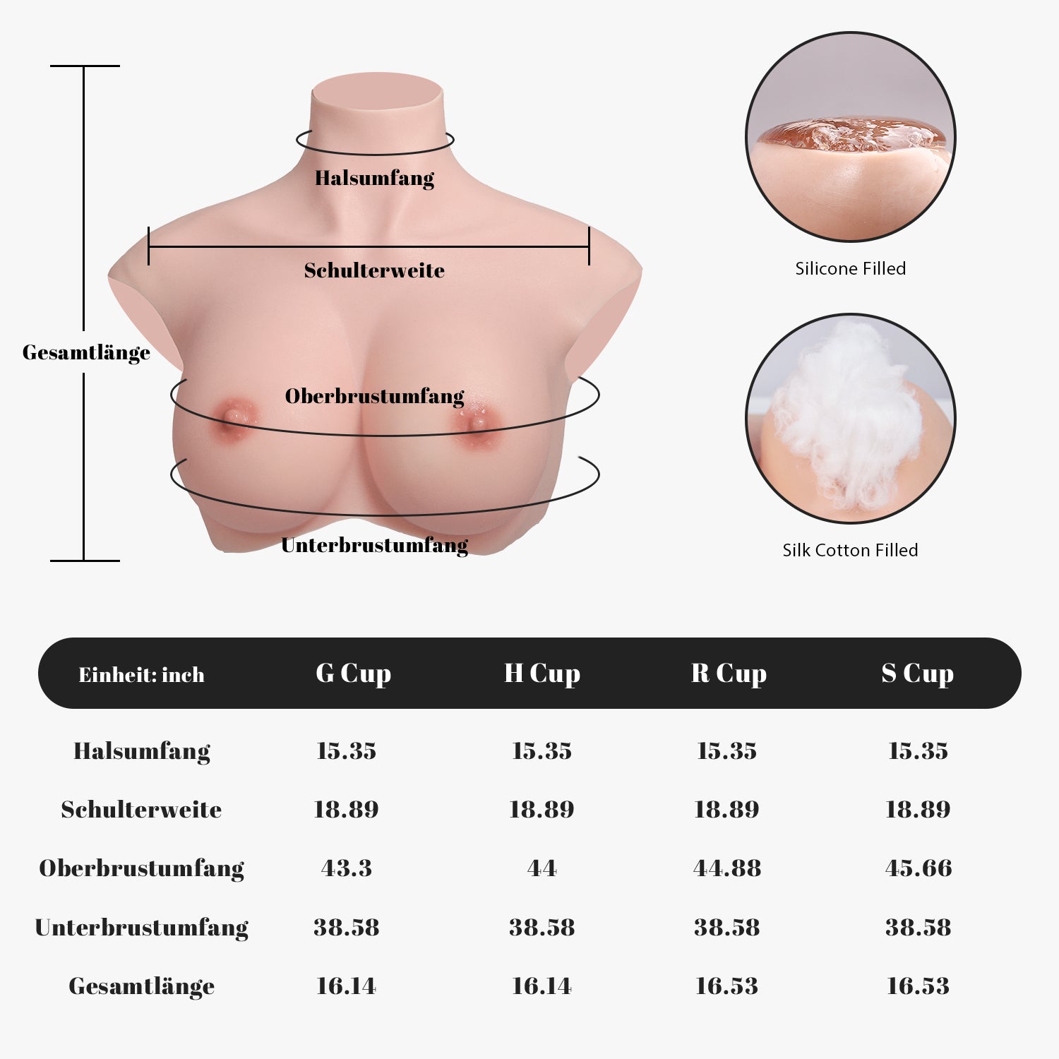 【オーバーサイズ】このシリコンブレストフォームはアンダーバスト周囲38.6インチの大きめのサイズで作られており、バストの大きなイギリス人の体型により適しています。